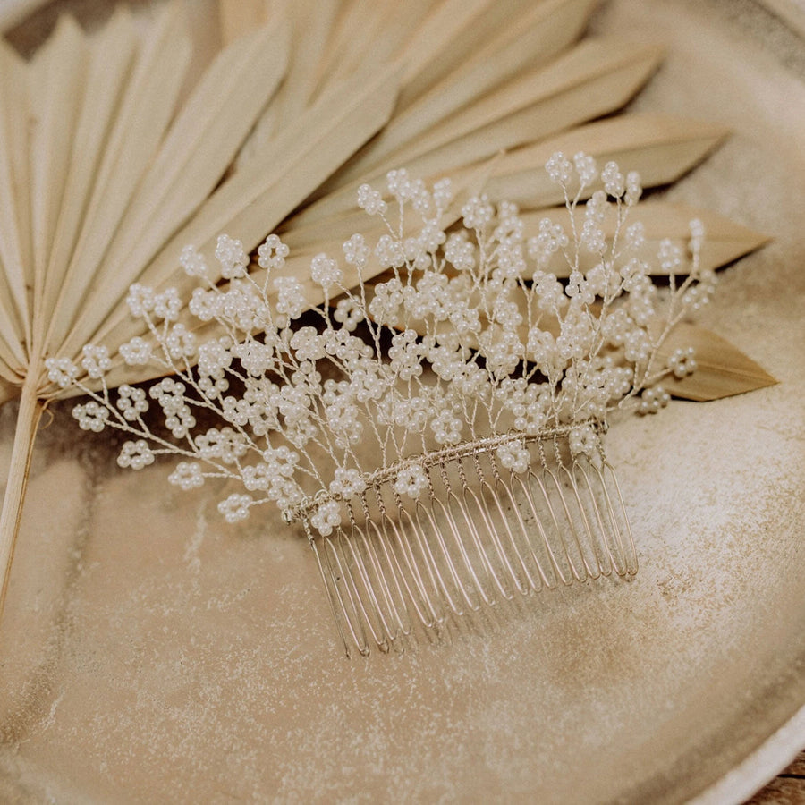 Ein romantisches Statement für deine Brautfrisur. Hier findest du für deine Hochzeit dein Vintage Headpiece, handgeflochten aus hochwertigem Metalldraht mit Perlen-Verzierung. Ein atemberaubender Akzent in deiner Hochzeitsfrisur, mit einer natürlichen Leichtigkeit. Der Kopfschmuck ist flexibel und kann von dir in deine Wunschpassform geformt werden.Haarkamm 11cm x 10cm